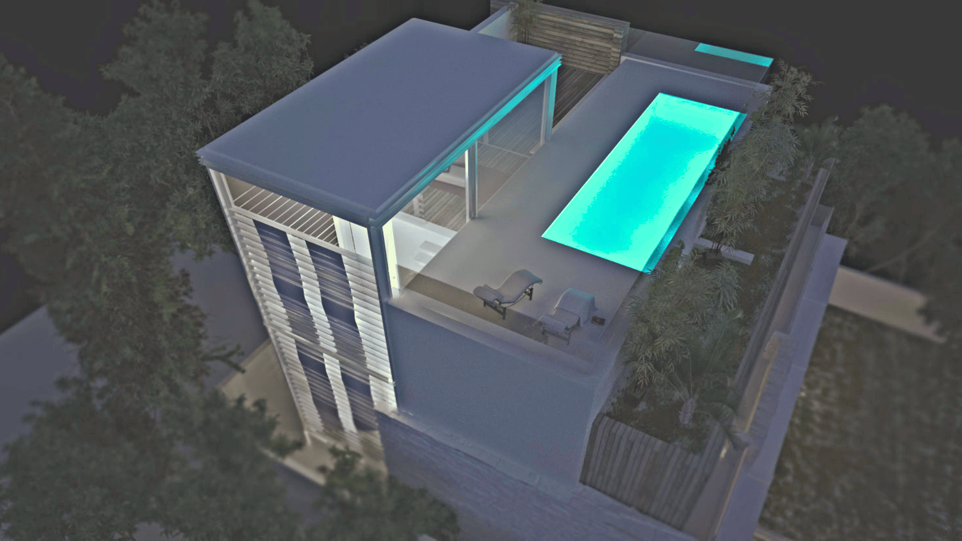Second Level Pool House offers 6,123.75 sqft of modern living space with 3 bedrooms, 5 bathrooms, 4 floors, 5 terraces, and 1 pool. Set in a warm location next to the sea, this home is designed to capture abundant sunlight and provide breathtaking views.